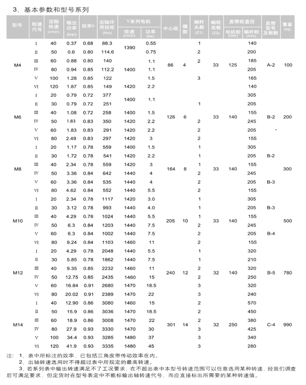 1.1本系列減速機二級減速傳動機構(gòu),一級為帶傳動,第二級為阿基米德圓柱蝸桿蝸輪傳動。其特點有:結(jié)構(gòu)緊湊傳動比大、工作平穩(wěn)可靠、無噪音、在蝸桿螺線導(dǎo)程角小的情況下減速機還具有自鎖性。