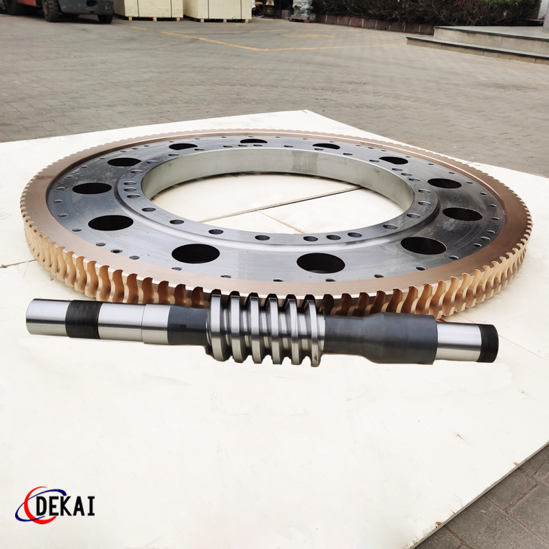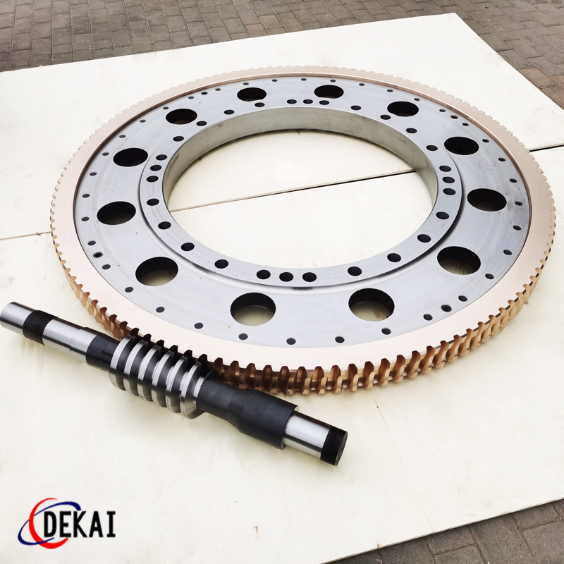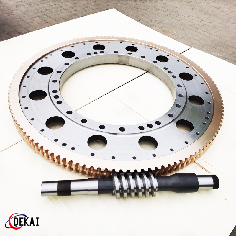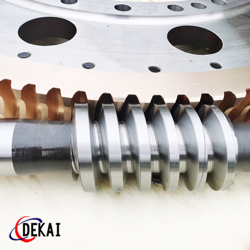 德州德凱減速傳動機(jī)械有限公司采用雙蝸桿對消隙原理開發(fā)生產(chǎn)的精密蝸輪蝸桿副,主要用于大型機(jī)床工作臺的驅(qū)動,高精密分割器等無間隙圓周運動精確定位場合。該蝸輪副中心距最大可做到2000mm,單節(jié)速比可做到1-365同時不產(chǎn)生回程間隙。